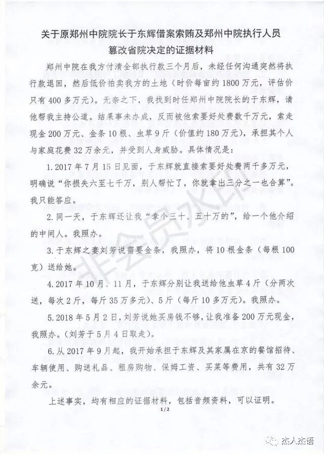 昨日,一段实名举报视频引发网络热议。视频中,一名自称是“河南省隆庆祥服饰有限公司总裁姜书敏”的女子,举着自己的身份证,“实名举报郑州中院原院长于东辉索贿500万元财物”。据其表示,于曾索要“六七千万的三分之一”,实际索得现金200万元、金条20根、虫草9斤,总价值约为500万元。