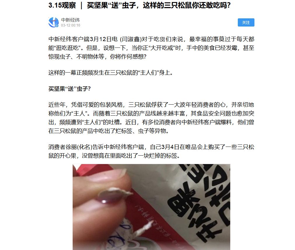 广告虚假宣传风波还未平息的三只松鼠股份有限公司(以下简称“三只松鼠”)又因“虫子”问题被推向风口浪尖。据报道,部分消费者在三只松鼠的产品中吃出了烂标签、虫子等异物。