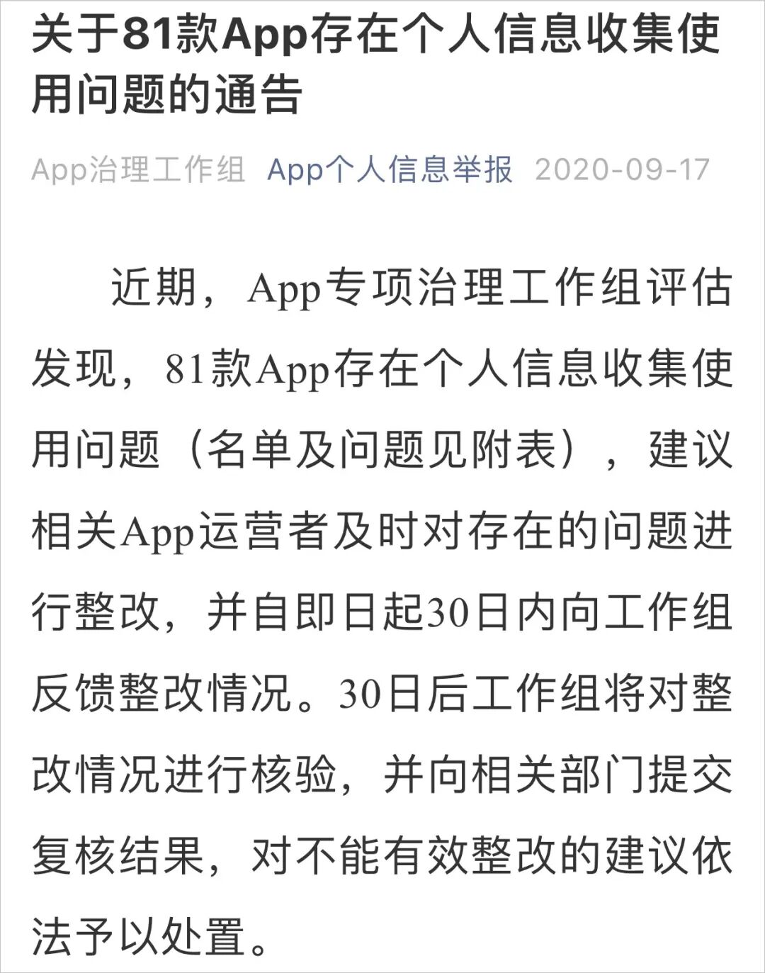 近日,由中央网信办、工信部、公安部、市场监管总局组成的App专项治理工作组发布通告,对暴走漫画、航班管家、掌上高铁等81款存在个人信息收集使用问题的App进行了集中曝光,下一步还将继续加大治理和处罚力度。