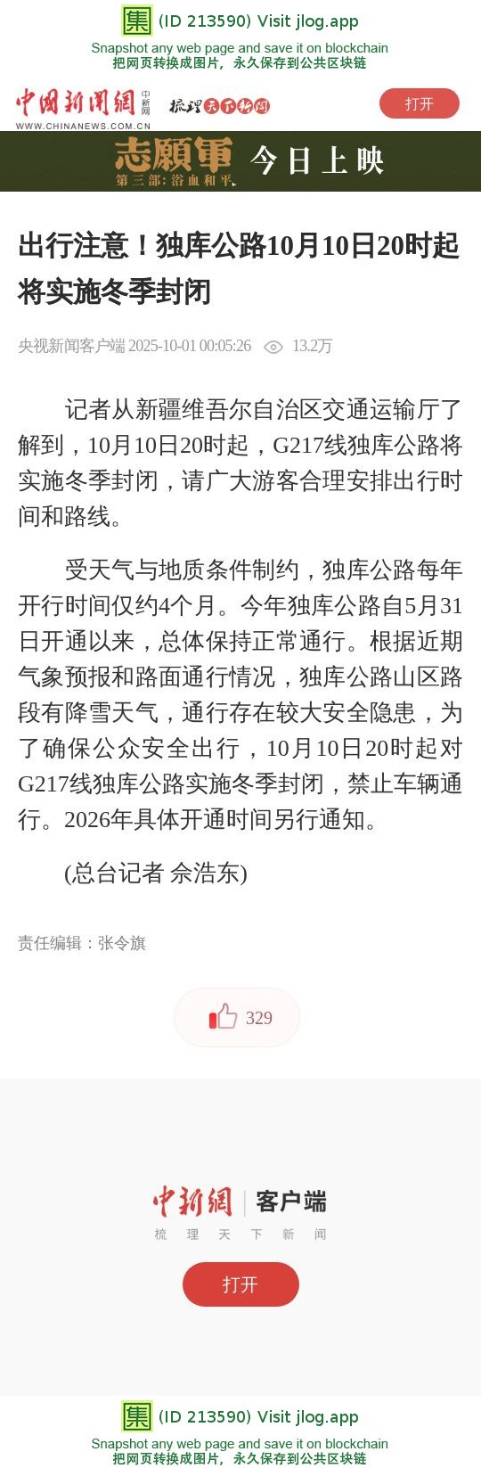 出行注意!独库公路10月10日20时起将实施冬季封闭