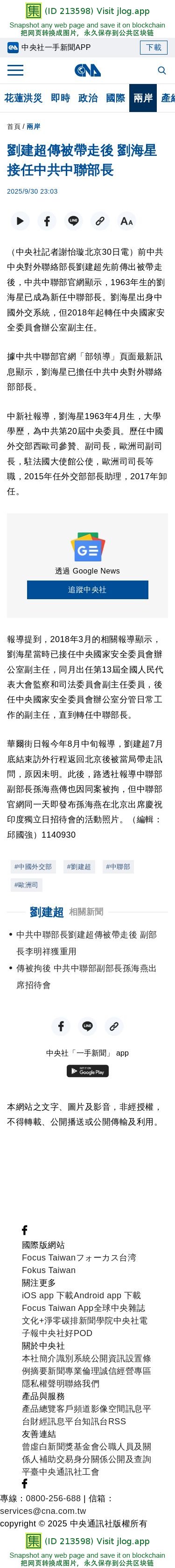 劉建超傳被帶走後 劉海星接任中共中聯部長 | 兩岸 | 中央社 CNA