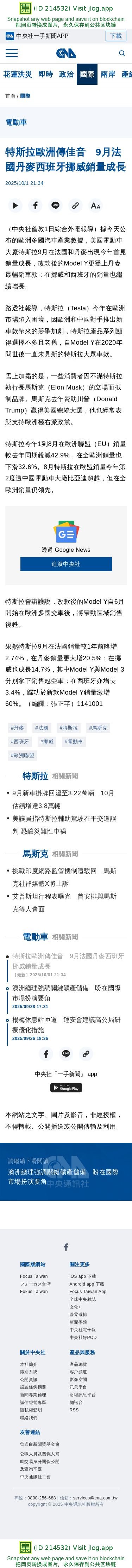 特斯拉歐洲傳佳音 9月法國丹麥西班牙挪威銷量成長 | 國際 | 中央社 CNA