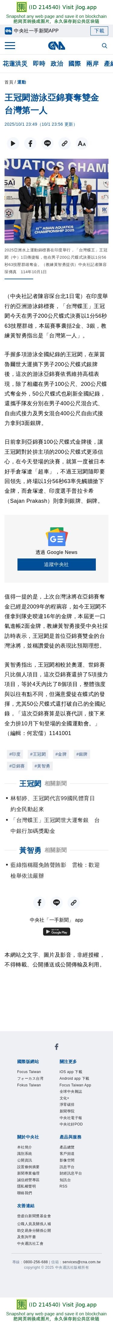 王冠閎游泳亞錦賽奪雙金 台灣第一人 | 運動 | 中央社 CNA