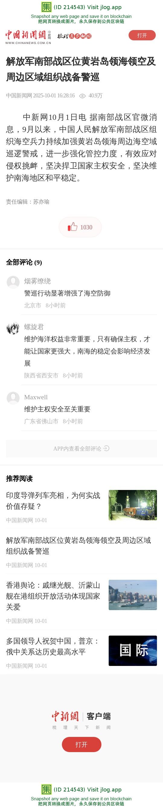解放军南部战区位黄岩岛领海领空及周边区域组织战备警巡