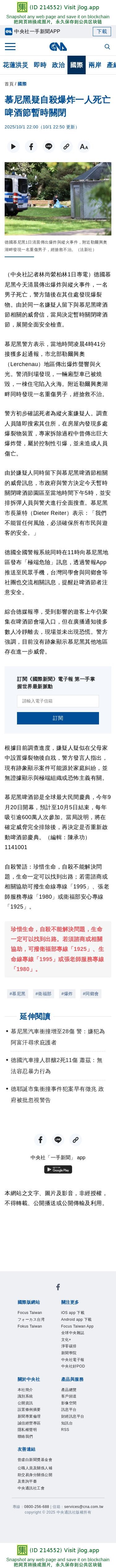 慕尼黑疑自殺爆炸一人死亡 啤酒節暫時關閉 | 國際 | 中央社 CNA