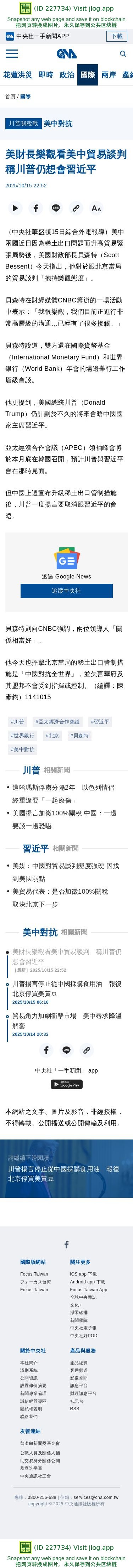 美財長樂觀看美中貿易談判 稱川普仍想會習近平 | 國際 | 中央社 CNA
