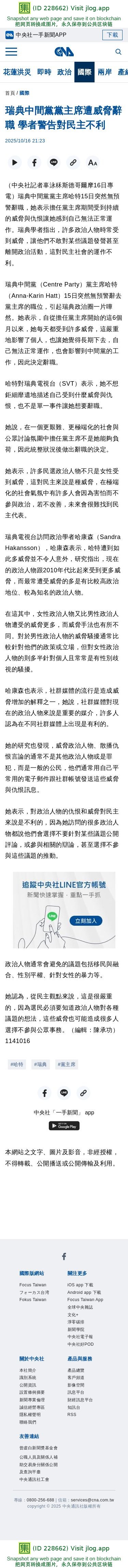 瑞典中間黨黨主席遭威脅辭職 學者警告對民主不利 | 國際 | 中央社 CNA