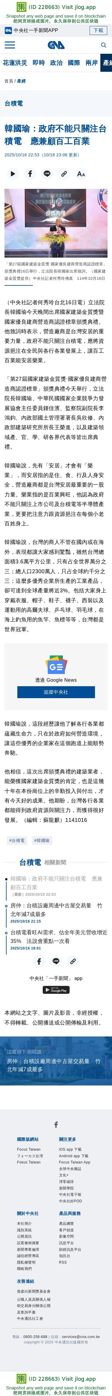 韓國瑜:政府不能只關注台積電 應兼顧百工百業 | 產經 | 中央社 CNA