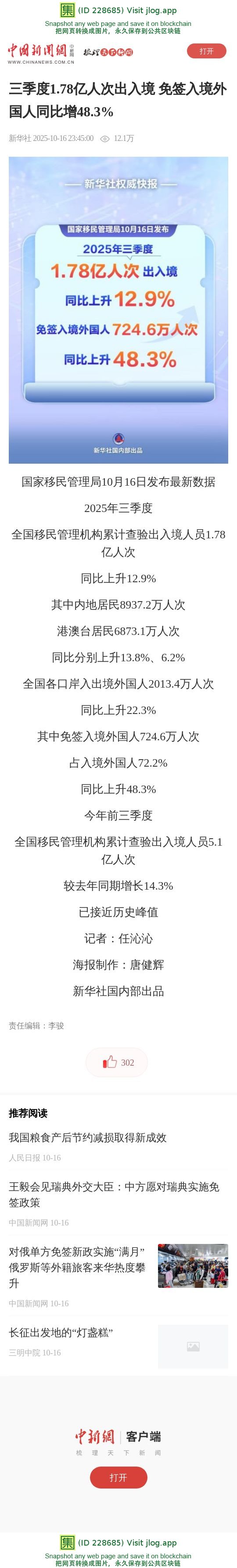 三季度1.78亿人次出入境 免签入境外国人同比增48.3%