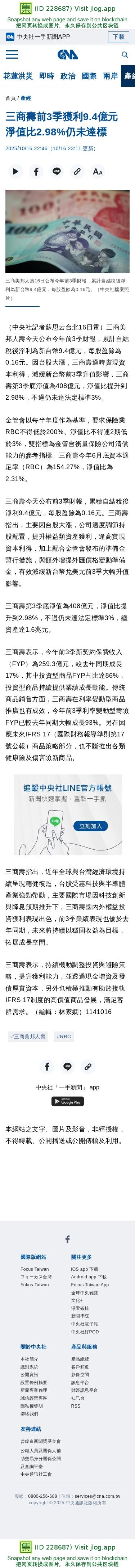 三商壽前3季獲利9.4億元 淨值比2.98%仍未達標 | 產經 | 中央社 CNA