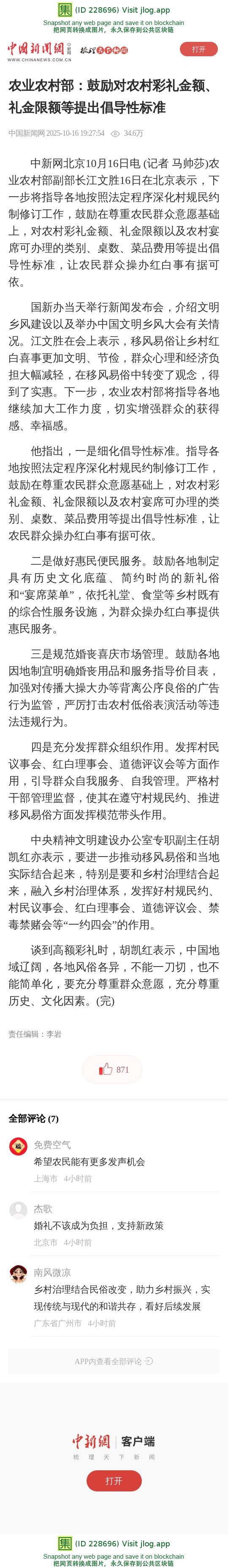 农业农村部:鼓励对农村彩礼金额、礼金限额等提出倡导性标准