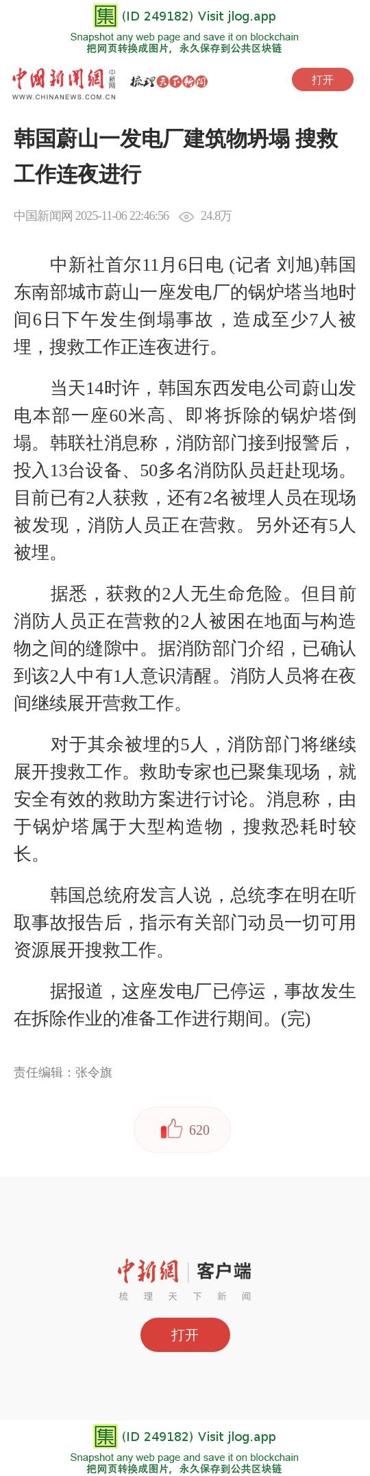 韩国蔚山一发电厂建筑物坍塌 搜救工作连夜进行