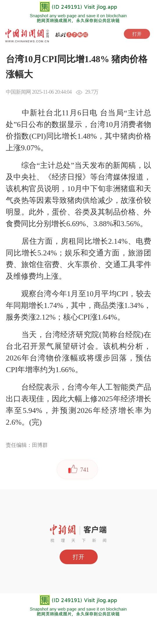 台湾10月CPI同比增1.48% 猪肉价格涨幅大