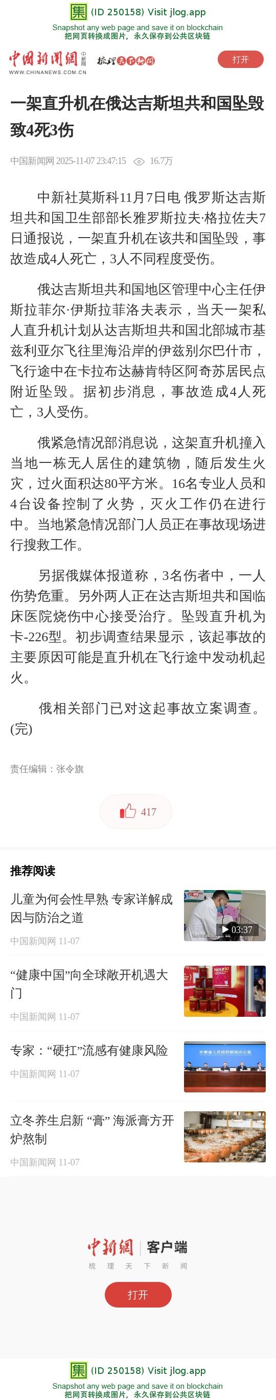 一架直升机在俄达吉斯坦共和国坠毁致4死3伤