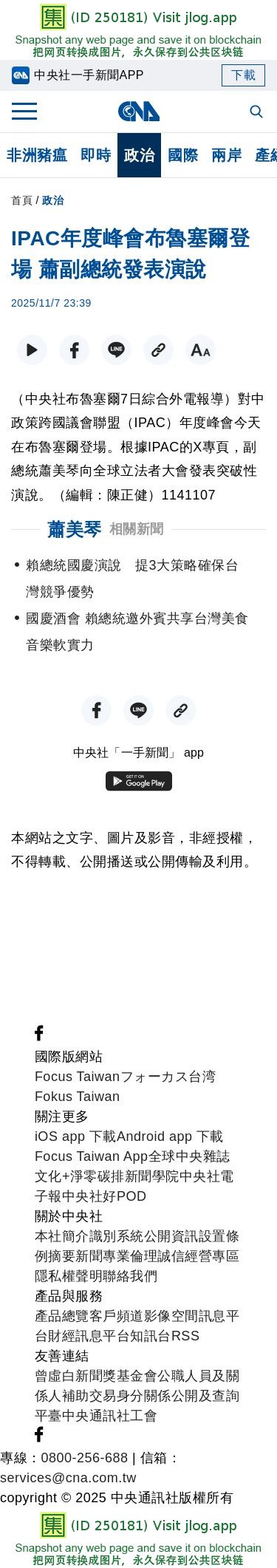 IPAC年度峰會布魯塞爾登場 蕭副總統發表演說 | 政治 | 中央社 CNA