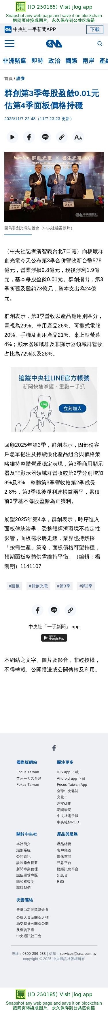 群創第3季每股盈餘0.01元 估第4季面板價格持穩 | 證券 | 中央社 CNA