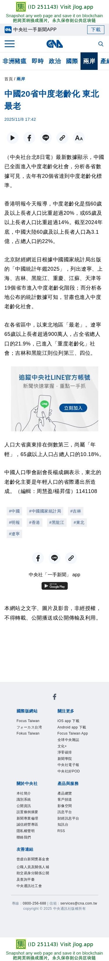 中國20省中度老齡化 東北最老 | 兩岸 | 中央社 CNA