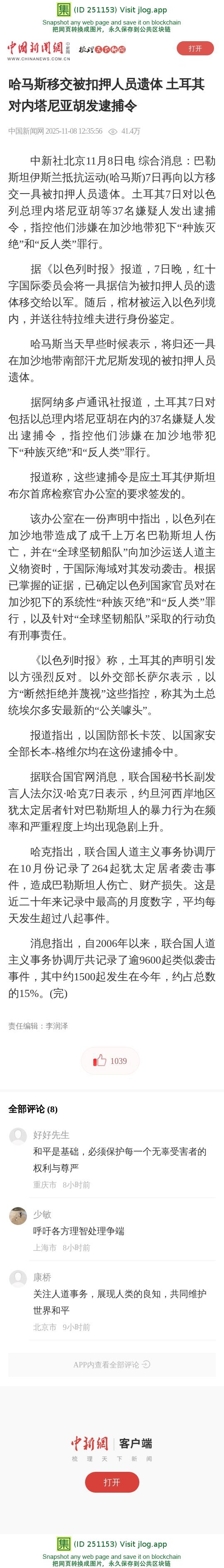哈马斯移交被扣押人员遗体 土耳其对内塔尼亚胡发逮捕令