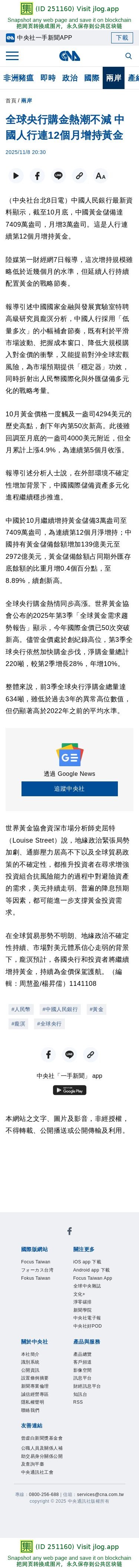 全球央行購金熱潮不減 中國人行連12個月增持黃金 | 兩岸 | 中央社 CNA