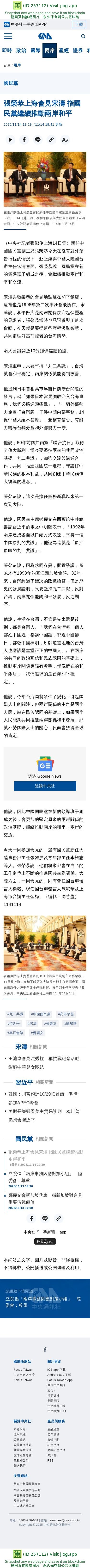 張榮恭上海會見宋濤 指國民黨繼續推動兩岸和平 | 兩岸 | 中央社 CNA