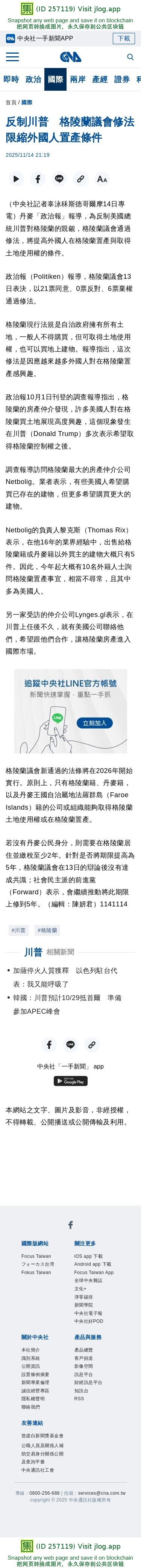 反制川普 格陵蘭議會修法限縮外國人置產條件 | 國際 | 中央社 CNA