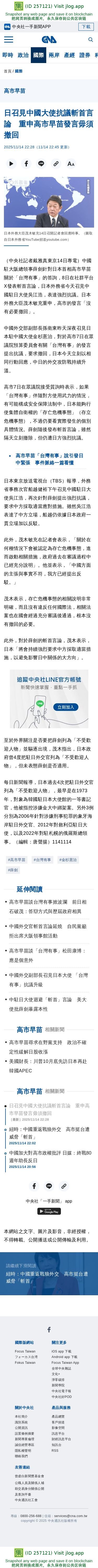 日召見中國大使抗議斬首言論 重申高市早苗發言毋須撤回 | 國際 | 中央社 CNA