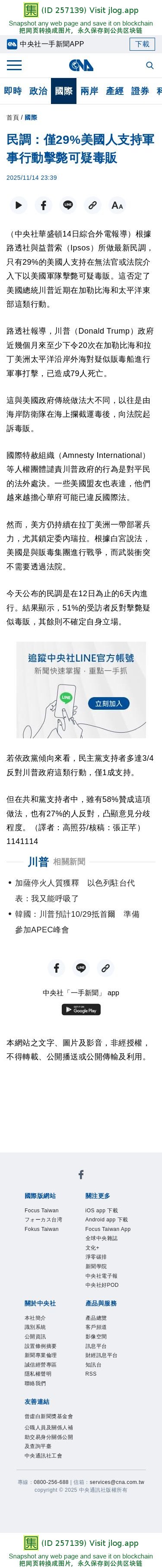 民調:僅29%美國人支持軍事行動擊斃可疑毒販 | 國際 | 中央社 CNA