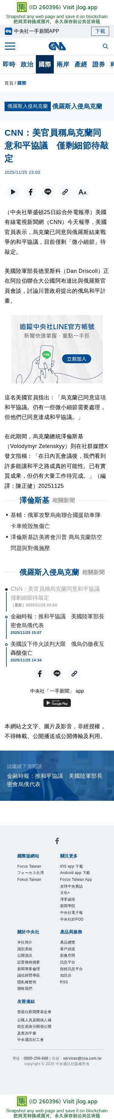 CNN:美官員稱烏克蘭同意和平協議 僅剩細節待敲定 | 國際 | 中央社 CNA