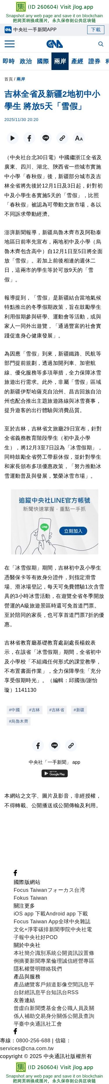 吉林全省及新疆2地初中小學生 將放5天「雪假」 | 兩岸 | 中央社 CNA