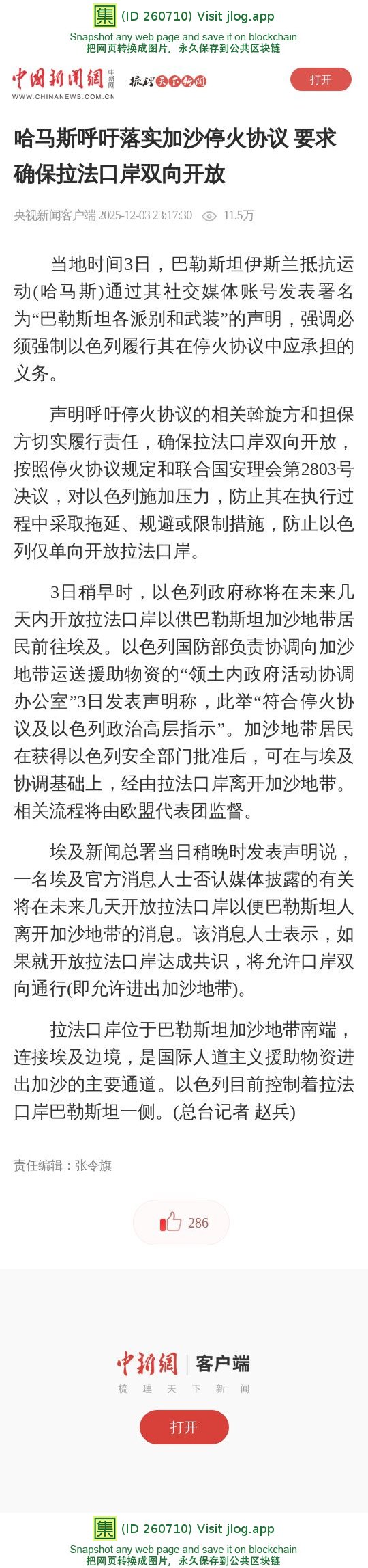 哈马斯呼吁落实加沙停火协议 要求确保拉法口岸双向开放