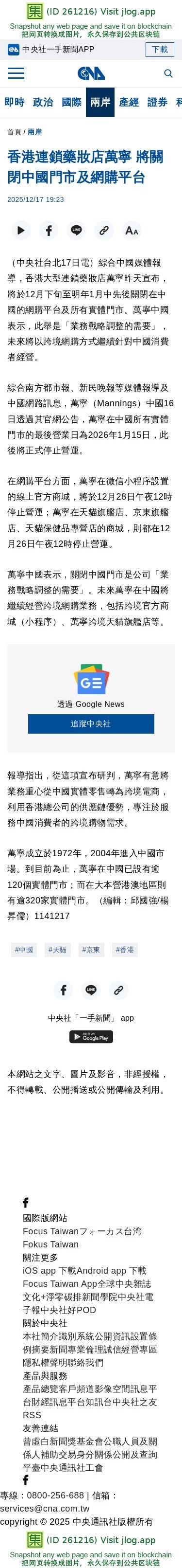 香港連鎖藥妝店萬寧 將關閉中國門市及網購平台 | 兩岸 | 中央社 CNA