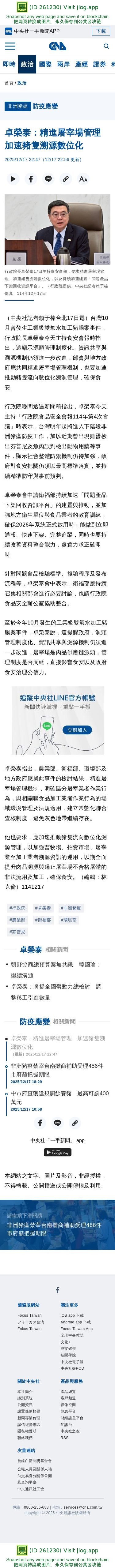 卓榮泰:精進屠宰場管理 加速豬隻溯源數位化 | 政治 | 中央社 CNA