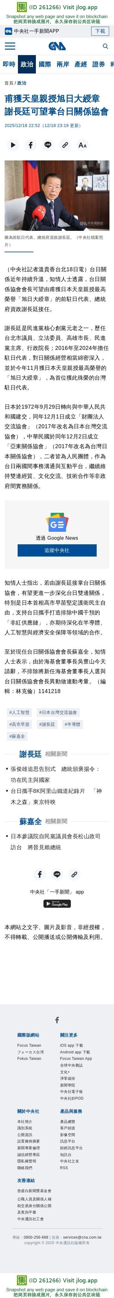甫獲天皇親授旭日大綬章 謝長廷可望掌台日關係協會 | 政治 | 中央社 CNA