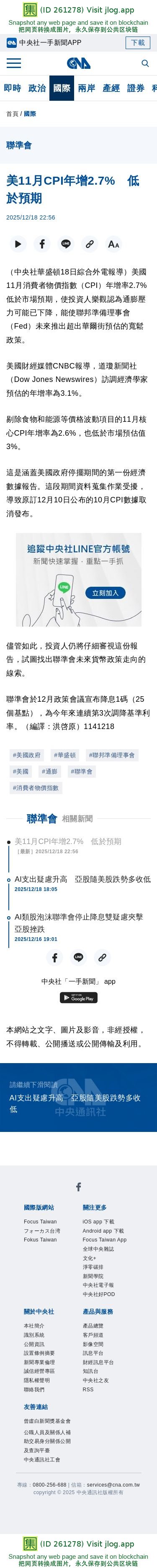 美11月CPI年增2.7% 低於預期 | 國際 | 中央社 CNA