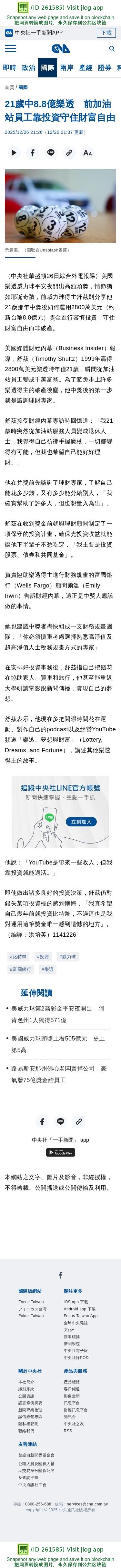 21歲中8.8億樂透 前加油站員工靠投資守住財富自由 | 國際 | 中央社 CNA