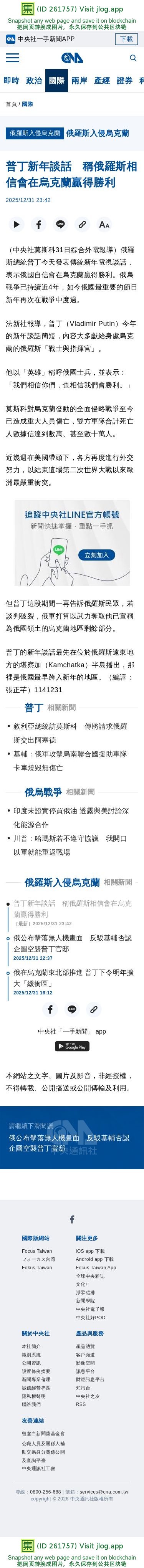 普丁新年談話 稱俄羅斯相信會在烏克蘭贏得勝利 | 國際 | 中央社 CNA