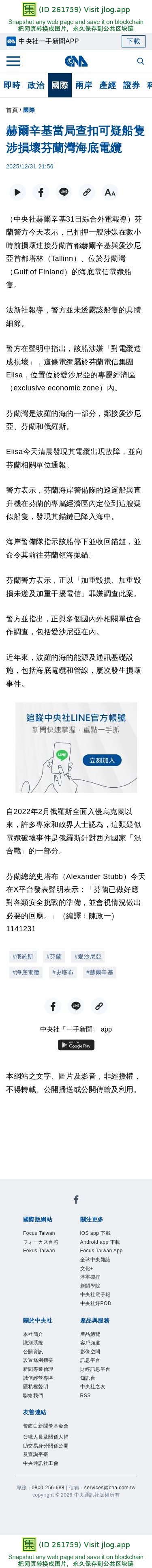 赫爾辛基當局查扣可疑船隻 涉損壞芬蘭灣海底電纜 | 國際 | 中央社 CNA