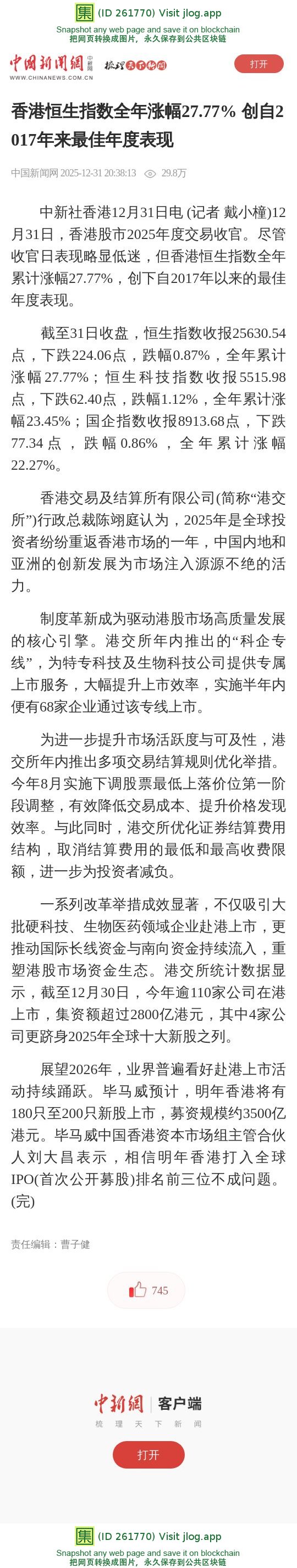 香港恒生指数全年涨幅27.77% 创自2017年来最佳年度表现