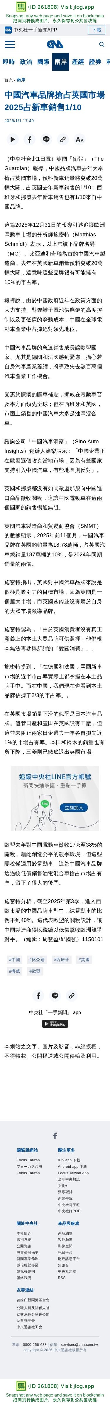 中國汽車品牌搶占英國市場 2025占新車銷售1/10 | 兩岸 | 中央社 CNA