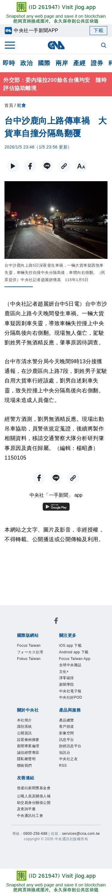 台中沙鹿向上路傳車禍 大貨車自撞分隔島翻覆 | 社會 | 中央社 CNA