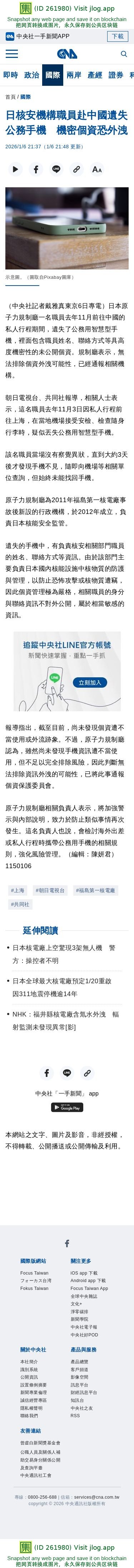 日核安機構職員赴中國遺失公務手機 機密個資恐外洩 | 國際 | 中央社 CNA
