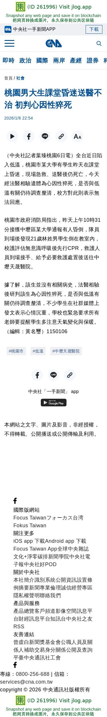 桃園男大生課堂昏迷送醫不治 初判心因性猝死 | 社會 | 中央社 CNA