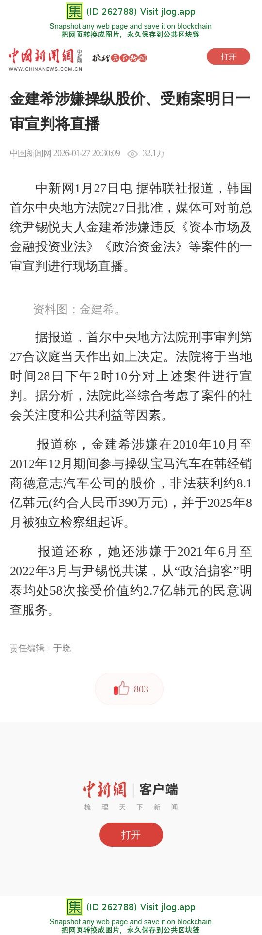 金建希涉嫌操纵股价、受贿案明日一审宣判将直播