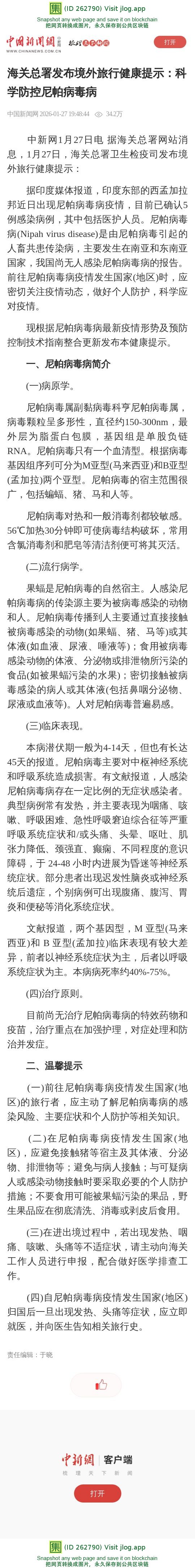 海关总署发布境外旅行健康提示:科学防控尼帕病毒病