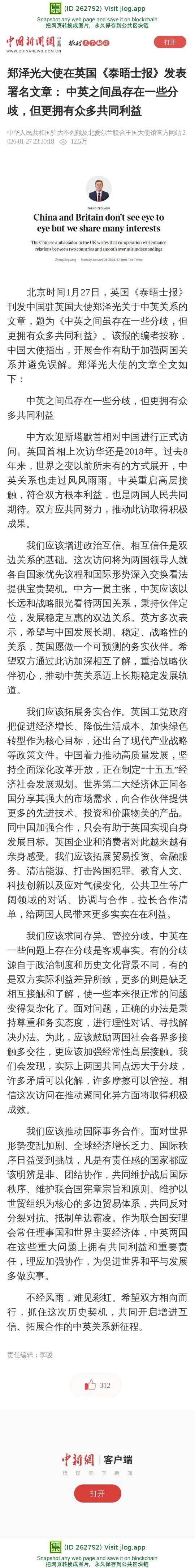 郑泽光大使在英国《泰晤士报》发表署名文章: 中英之间虽存在一些分歧,但更拥有众多共同利益