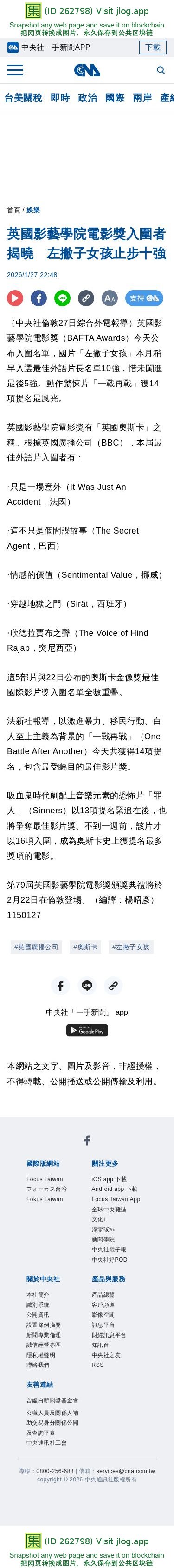 英國影藝學院電影獎入圍者揭曉 左撇子女孩止步十強 | 娛樂 | 中央社 CNA