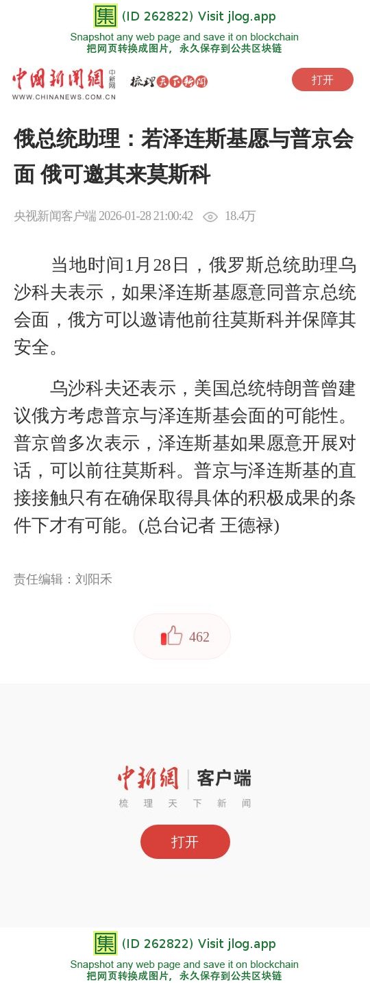 俄总统助理:若泽连斯基愿与普京会面 俄可邀其来莫斯科