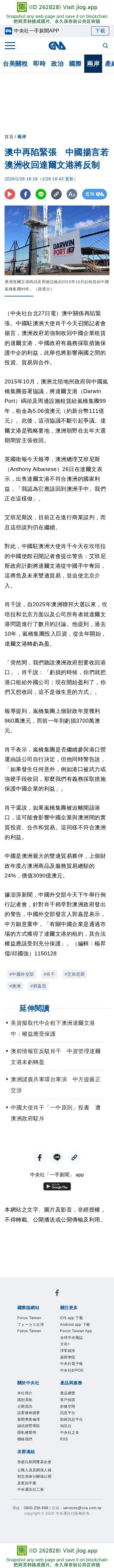 澳中再陷緊張 中國揚言若澳洲收回達爾文港將反制 | 兩岸 | 中央社 CNA