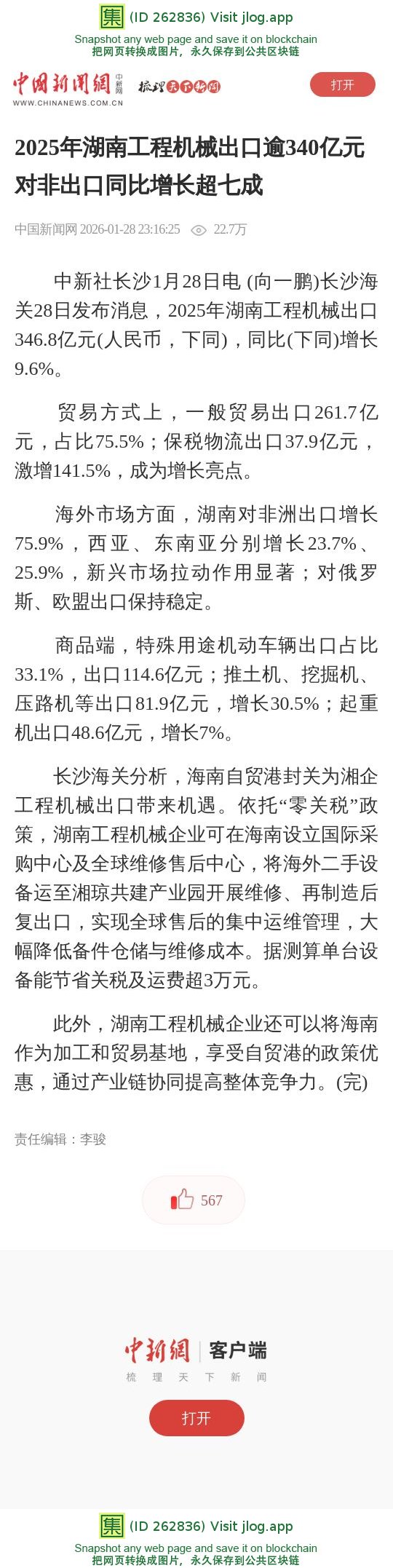 2025年湖南工程机械出口逾340亿元 对非出口同比增长超七成