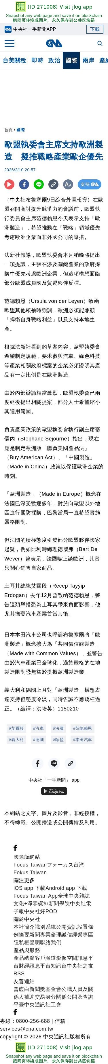 歐盟執委會主席支持歐洲製造 擬推戰略產業歐企優先 | 國際 | 中央社 CNA